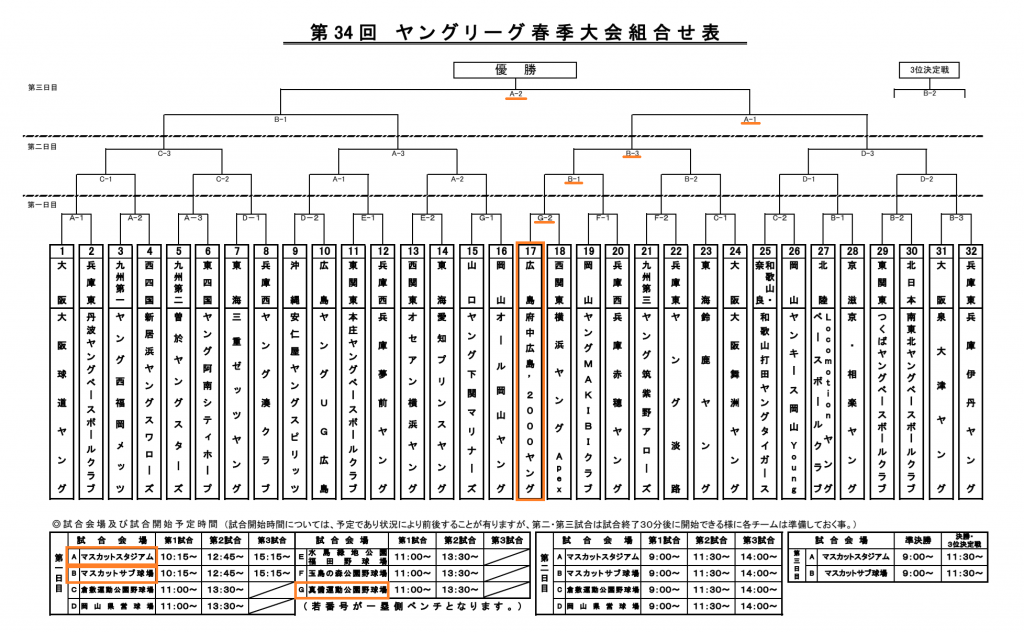 第34回ヤングリーグ春季大会組合せ 2026年3月28日㈯から岡山県倉敷市を中心に開催される「第34回ヤングリーグ春季大会」の組み合わせが決定しました ヤングリーグ – 2026第34回ヤングリーグ春季大会