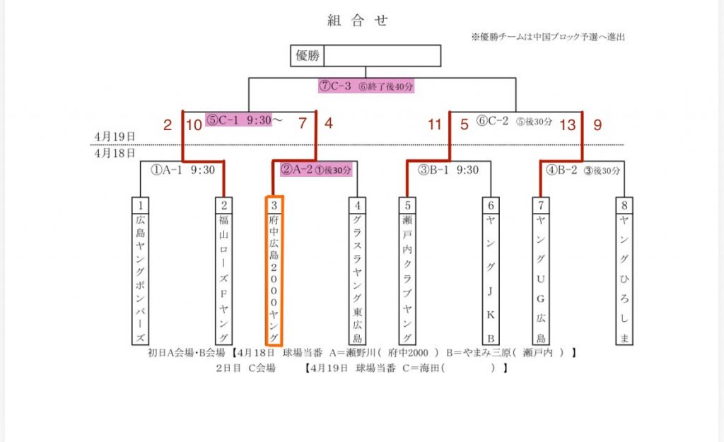 第14回ヤングリーグジュニア選手権大会広島支部予選 初日 2026年4月18日㈯ 瀬野川公園野球場1回戦<1塁側>先攻 後攻<3塁側> 府中広島❜2000ヤング 7-4 グラスラヤング東広島バッテリー:福本、桑田、新中 - 小山 三塁打:清末、藤尾二塁打:鹿島 ツイート